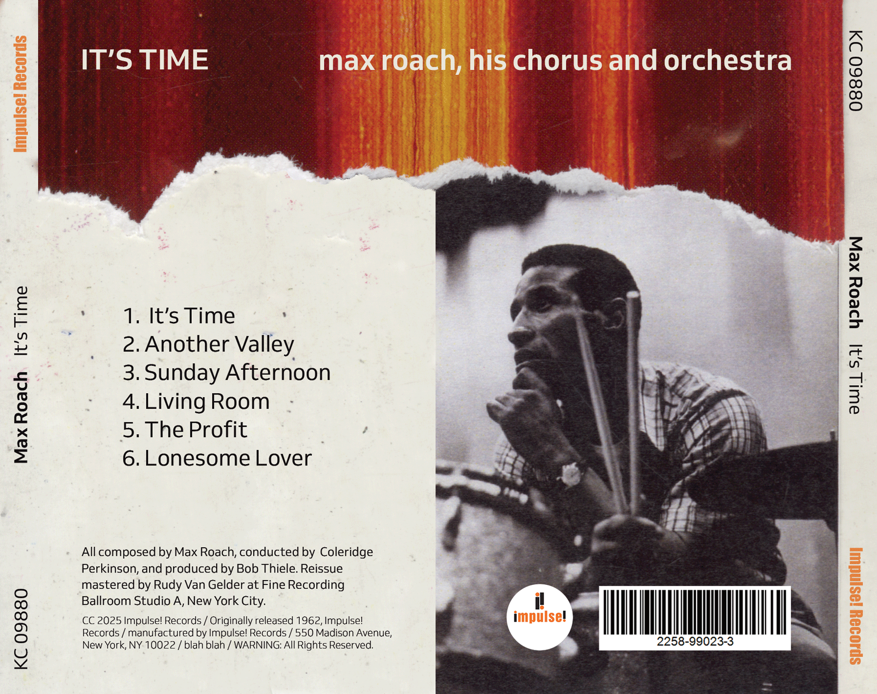 A CD packaging redesign for Max Roach's album It's Time. A multimedia work, using collage, Letraset, ink painting on acetate, and digital type.